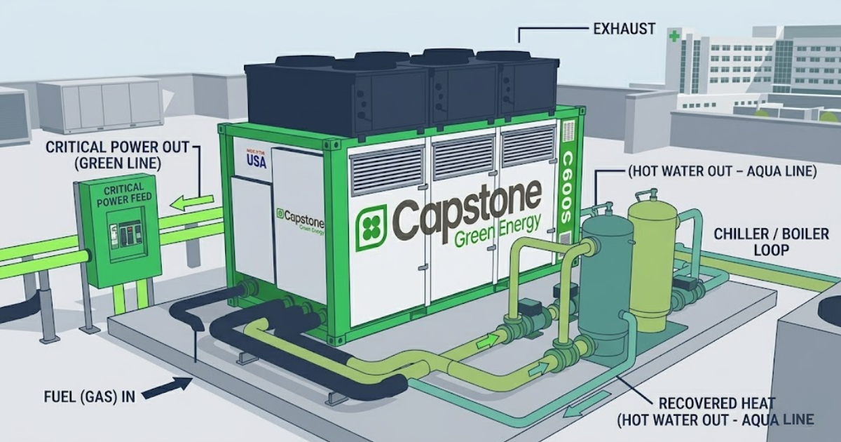 En un sistema de cogeneración para un hospital, el chiller utilizaría el calor residual de una turbina de gas para generar el agua fría que necesita el aire acondicionado. De manera adicional este calor residual permitiría la generación de vapor y agua caliente requeridos para los servicios hospitalarios.